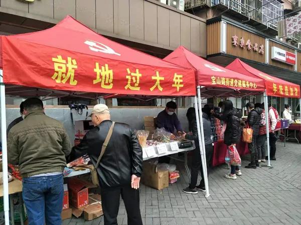 今天上午,为了让工作和生活在上海的外来务工人员感受到过年的味道,一排红色大棚搭建在宝山社区党群中心的门口,以低于市场价的优惠价格带来各色年货,为留沪外来务工人员节日期间购买年货提供便利,享受过年喜庆氛围.