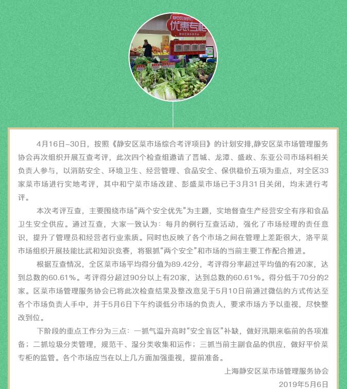 【菜场信息】2019年4月静安区菜市场综合考评行业互查结果发布
